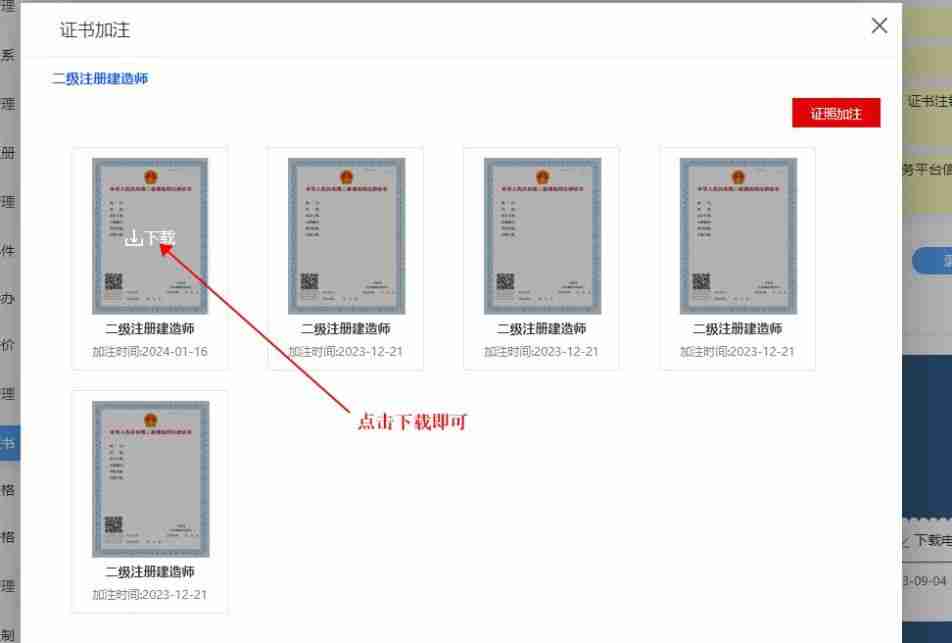 人員登錄【江西住建云】個人服務平臺,在【我的證書】模塊內(nèi),找到二級注冊建造師電子證書。下載證書的操作流程如:點擊【下載電子證書】按鈕,通過微信小程序掃碼認證后,點擊【證書加注】。待證書加注成功后,即可下載電子證書。